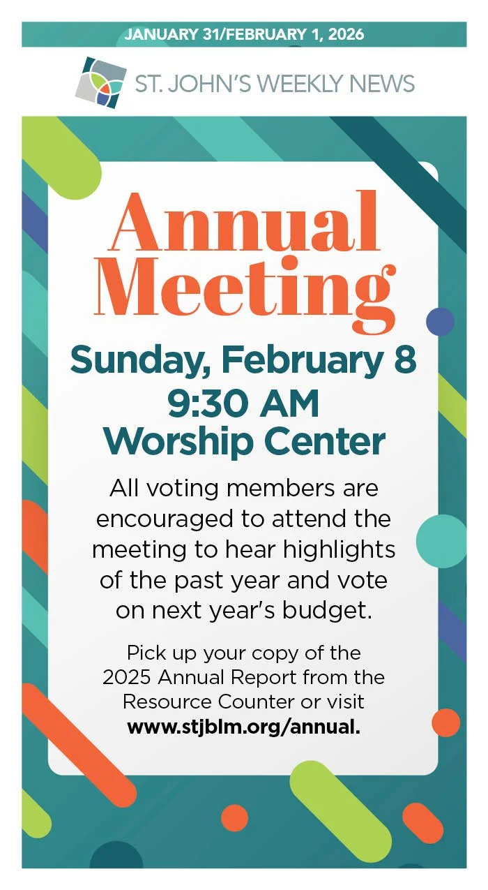 Please plan to attend the Annual Meeting next Sunday at 9:30 AM. In preparation, I ask that you please look over the Annual Report, found on the Resource Counter or at www.stjblm.org/annual to see all the wonderful ministries that St. John’s undertook in this past year.
